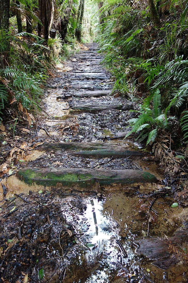 The Henderson Tramline Loop in the Kaimai Range is a short distance south of Tauranga, just off SH29. Unfortunately there are no expansive views from this track, which starts on Old Kaimai Rd, and ends about 1.5km away, also on Old Kaimai Rd. Large parts of the track follow the Henderson Tramline Western Branch and Northern Branch. These tramlines were constructed to transport logs when the forest was milled. None of the rails survive, but there are remains of the tramline sleepers in several places.