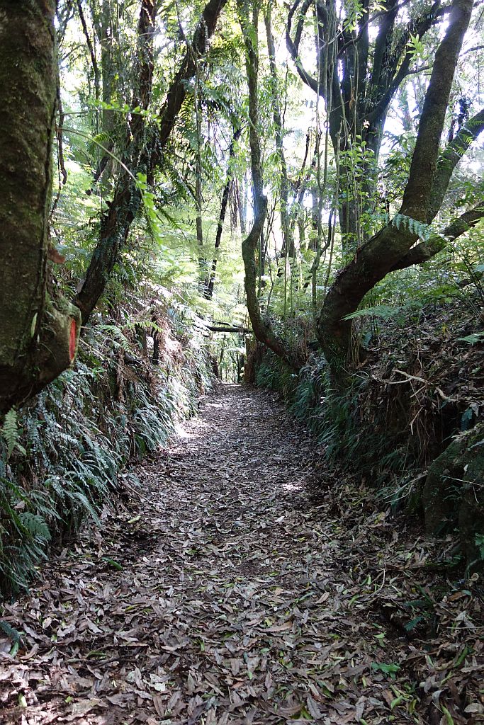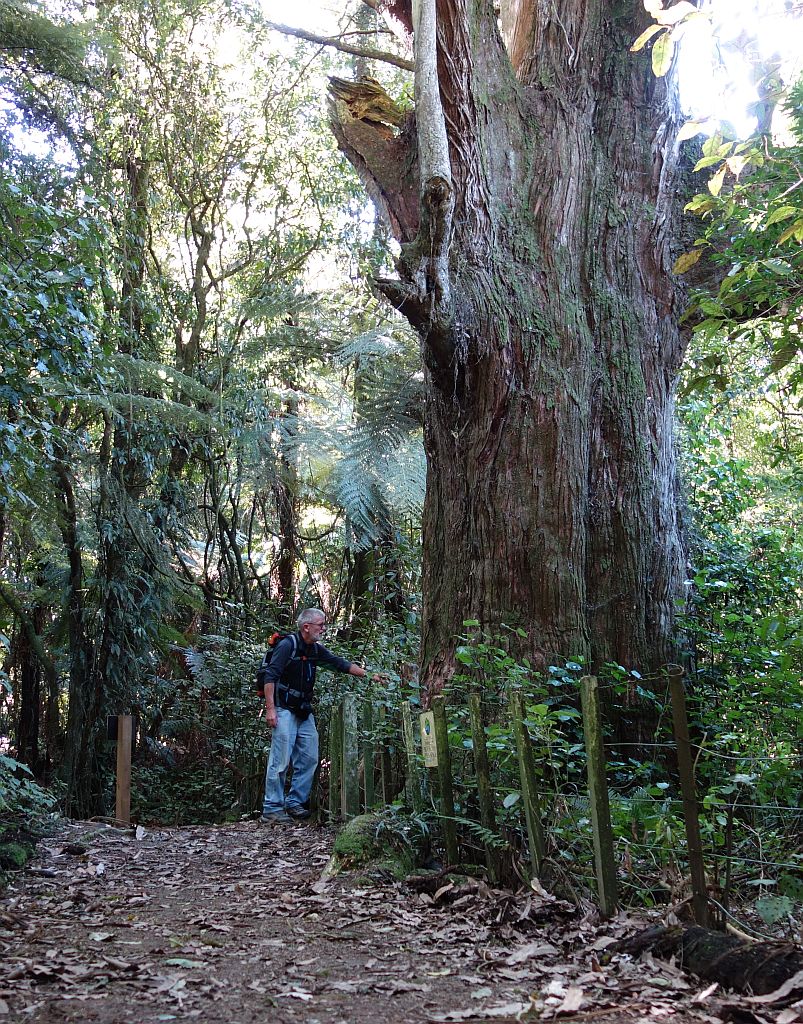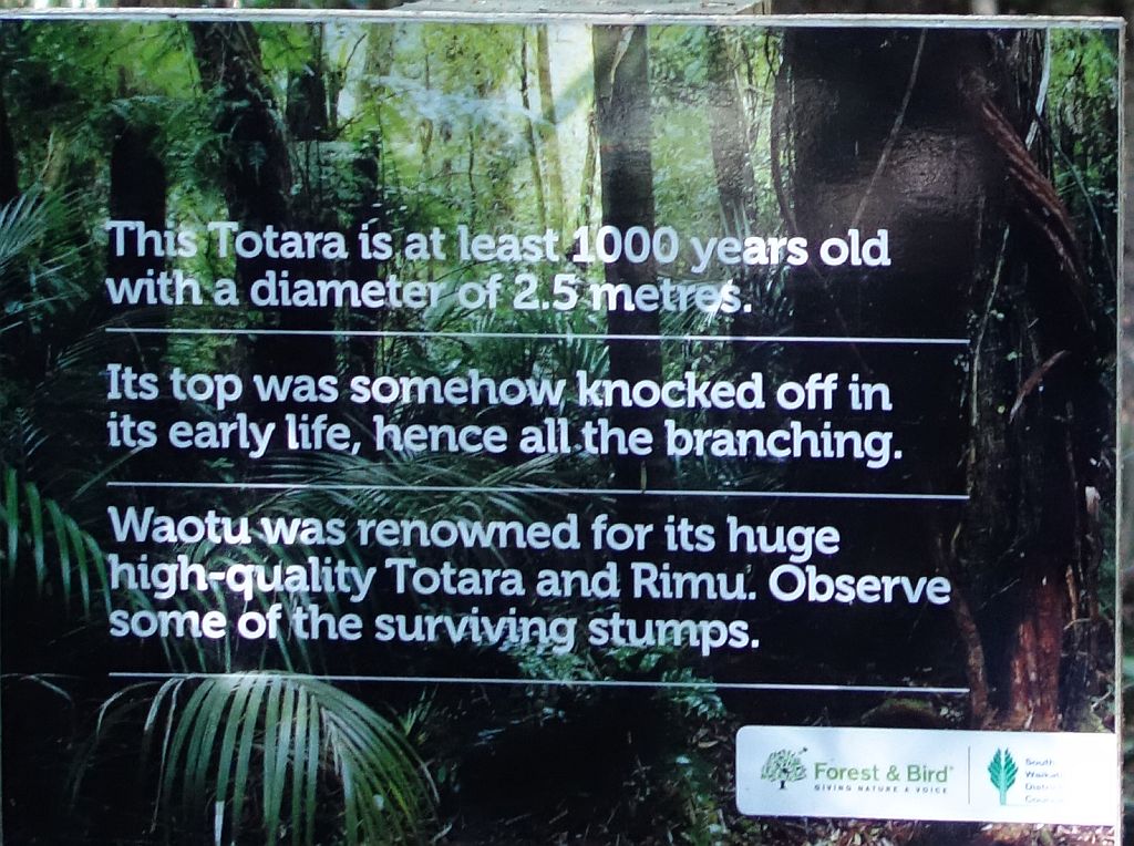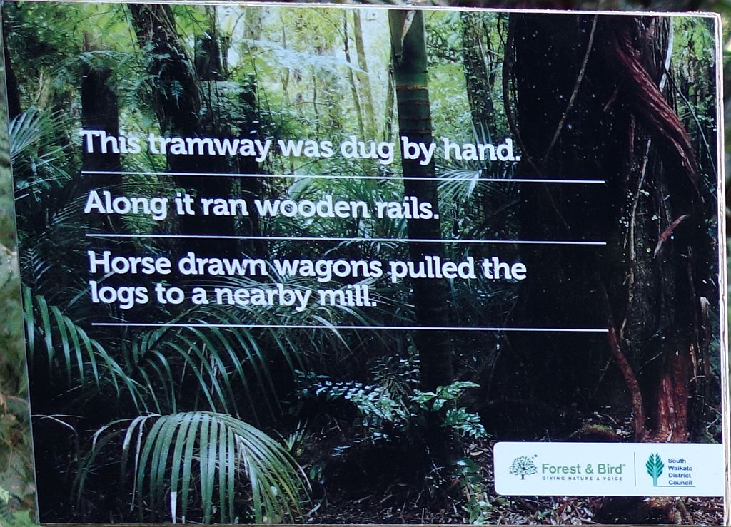 The forest was milled about 100 years ago, but fortunately some larger trees were left untouched, Including a large 1000-year-old totara which was not suitable for milling. Tramlines are still visible, although all trace of sleepers and rails are long gone. Apparently the rails were made of wood.