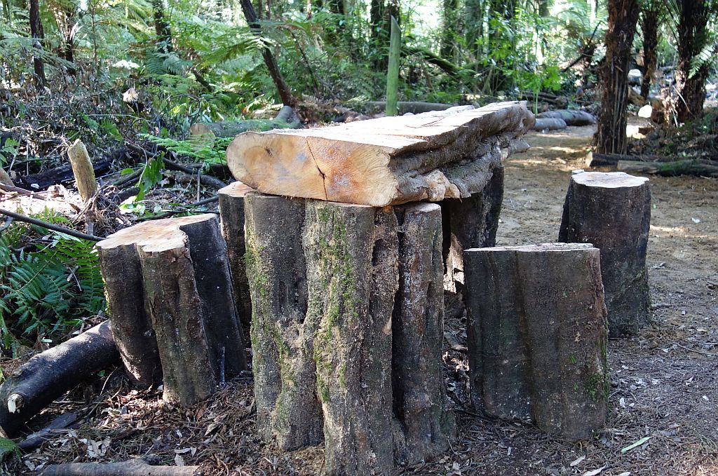A very simple picnic table with seats, probably made by volunteers clearing a few trees to make way for a new track.