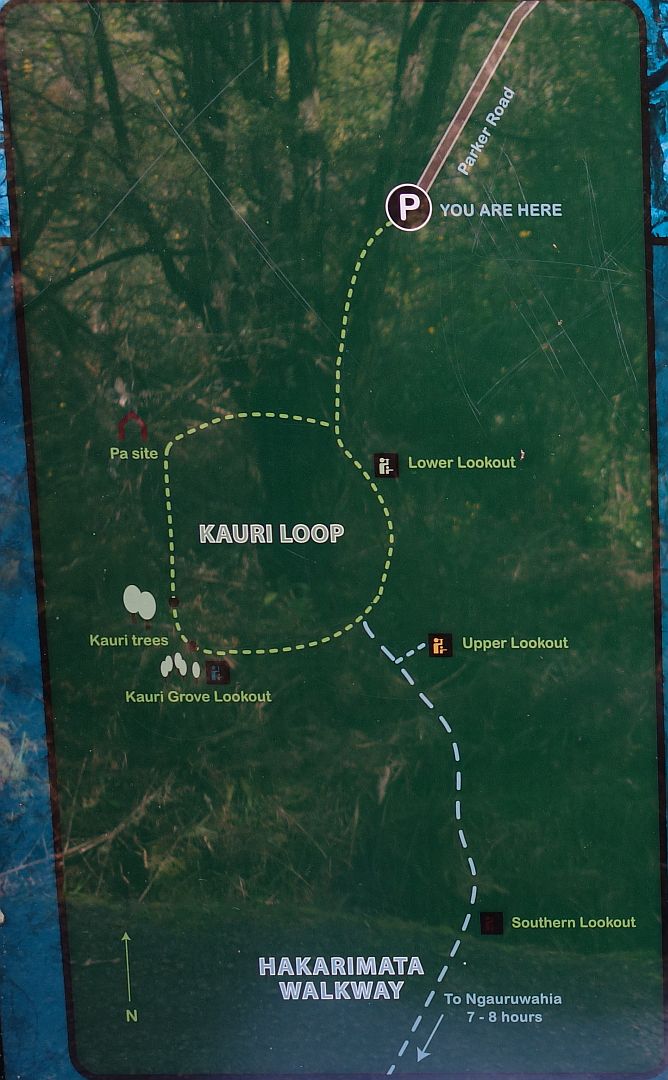 The total distance from the carpark to the southern lookout and back, taking one branch of the kauri loop on the way up and the other on the way down, is about 4,5km, and took about 2 hours.
