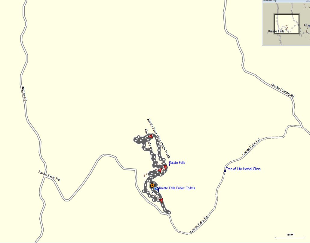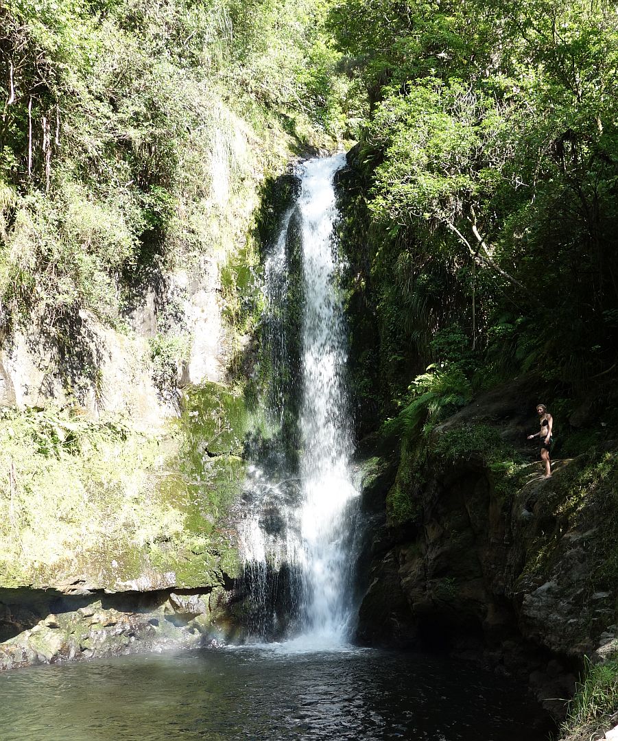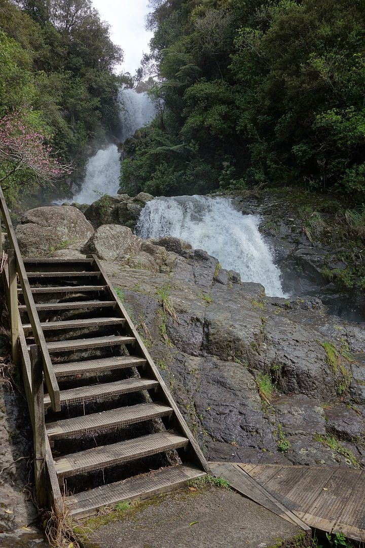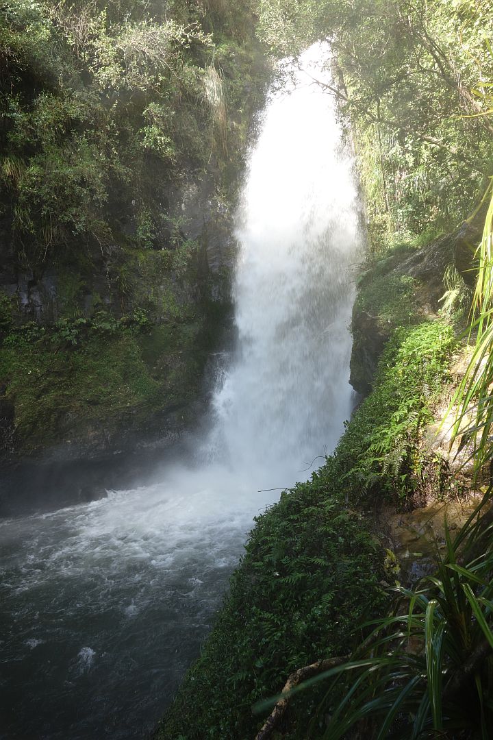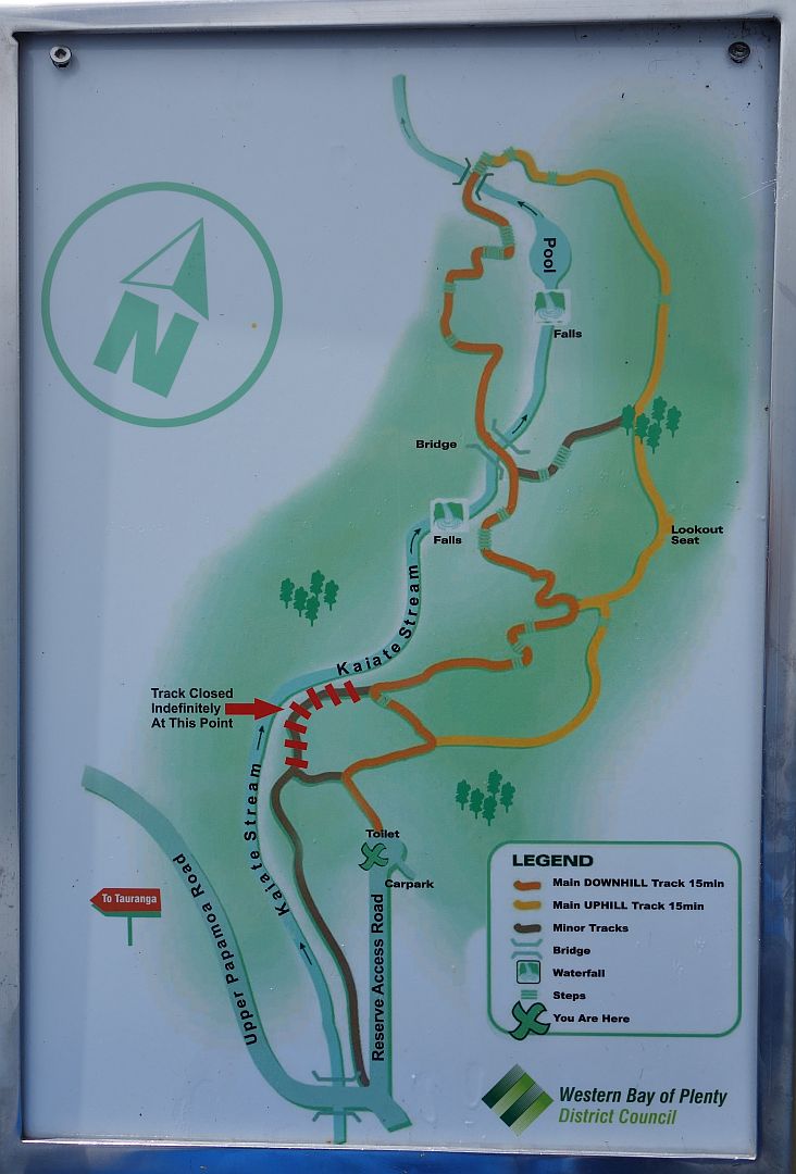Kaiate Falls Scenic Reserve, Te Rerekawau, is only a short distance from Tauranga, accessible from Kaiate Falls Rd. There is a parking area, toilet, and a track map on a short, narrow access road by the bridge over the Waitao Stream. The tracks are well formed, with steps in the steepest places. There may be mud on the tracks, and the rocks can be slippery when wet.