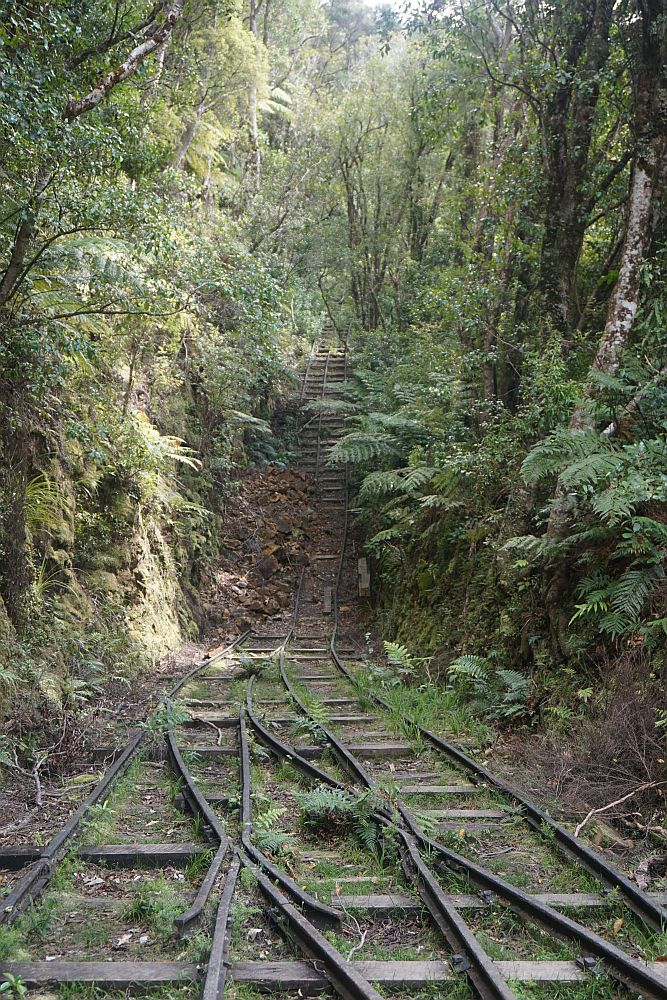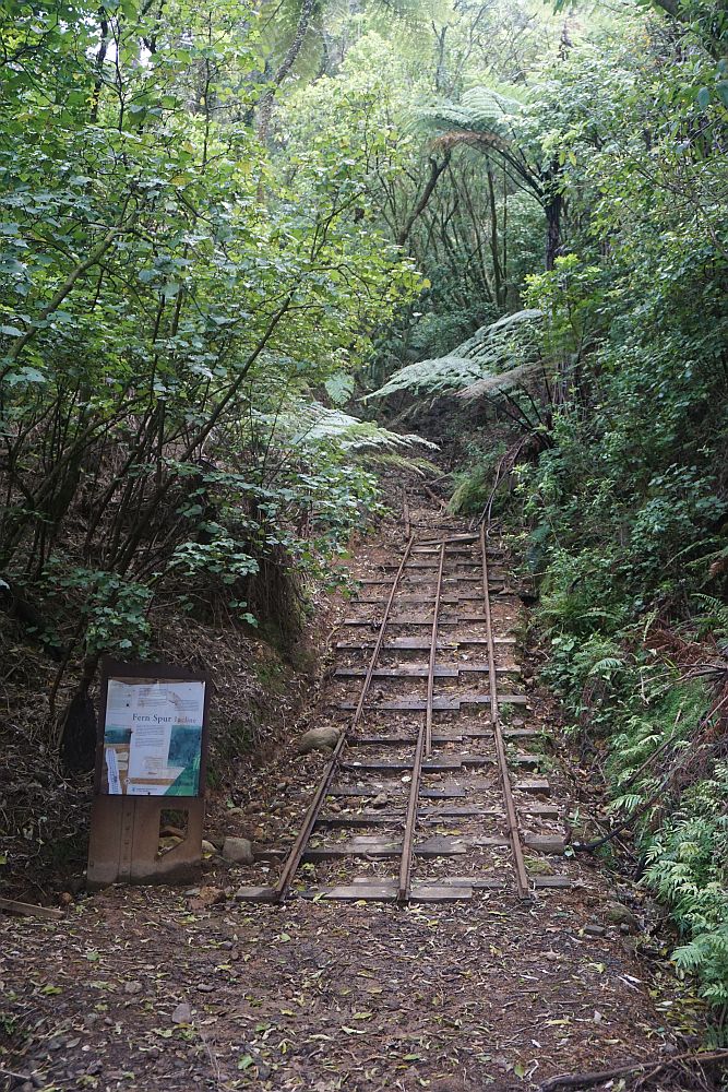 The rails on the lowest incline, Fern Spur Incline, have almost all been removed or stolen. Only two very short sections at the bottom end and at the top end have been reconstruction. There is no track following the exact route of the incline, but the High Level Pack Track does give access to both ends of the incline, and goes through a cutting where the incline passed over the track.
