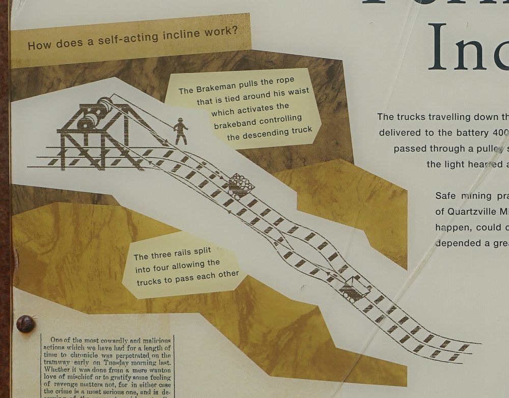 The inclines were self-operating, with heavy full carts on the way down pulling the lighter empty carts on the way up. There were 3 rails, dividing into 4 at the halfway point, so the upward and downward carts could pass each other. The winch headframe had two wire rope reels on a common axle, wound in opposite directions so that turning the axle would unwind one reel and wind up the other one. There was an operator, a brake man, operating the winch brakes to avoid the runaway carts causing damage at the bottom of the incline. Butlers Incline operated with a total of 2.5 tonnes of wire rope.