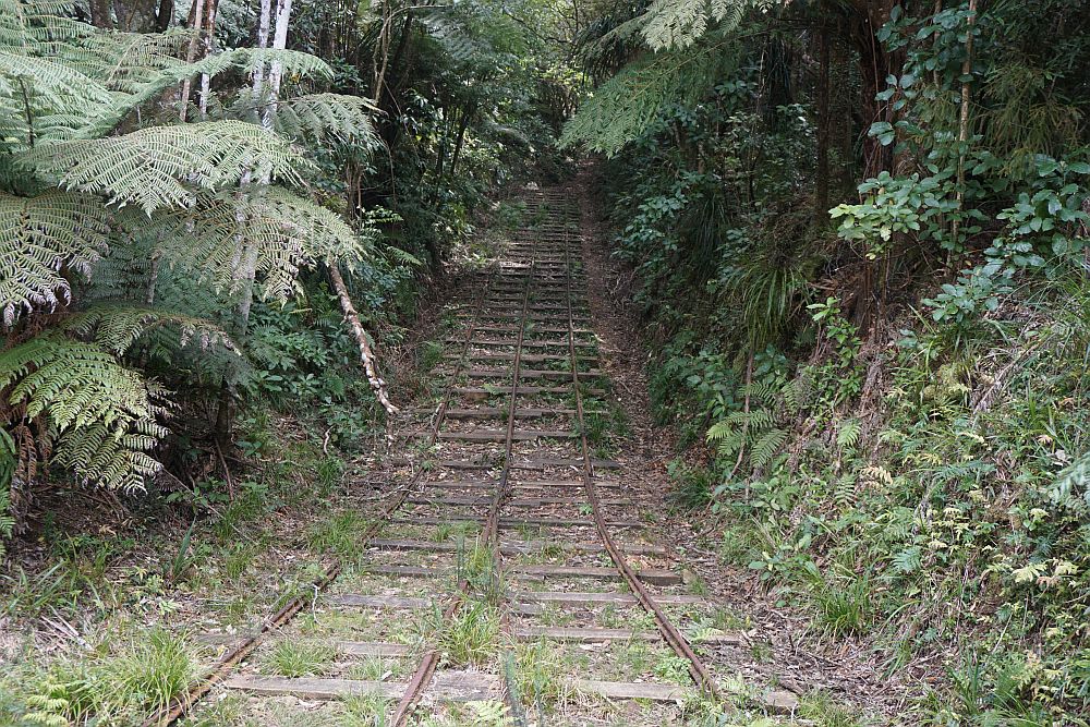 Looking down the newly reconstructed rail at the upper end of the Fern Spur Incline. The Waiorongomai Village was situated next to the stream visible in the centre of the photo.