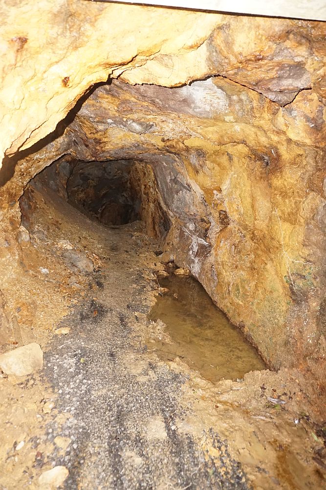 Inside the rail tunnel. Some of the wall has collapsed, the floor is uneven, and the roof is low, so a torch (flashlight) is recommended when walking through the tunnel. It is only about 25m long, but has a bend which prevents visibility straight through the tunnel.