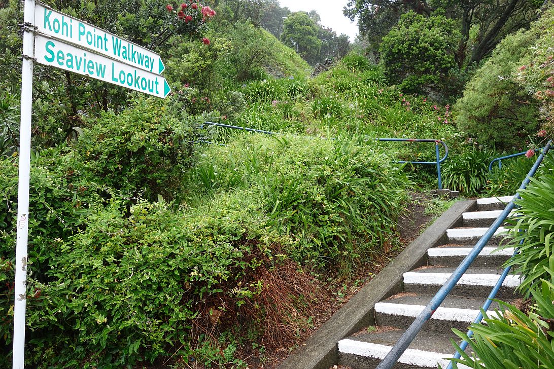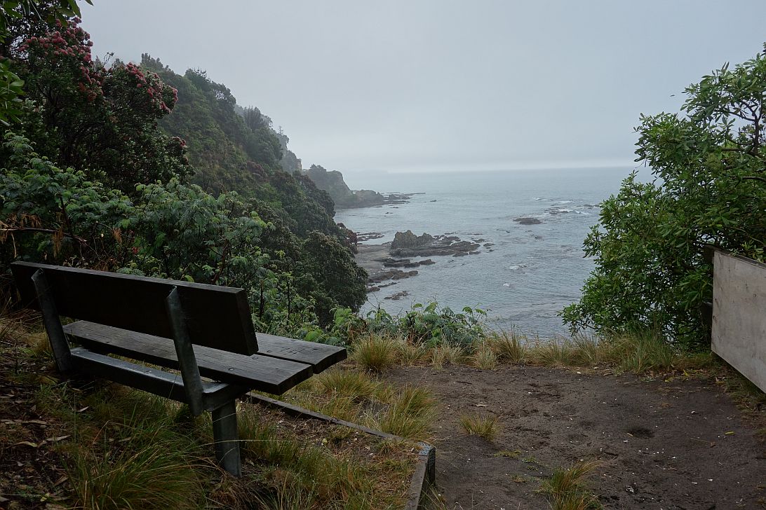 The Kohi Point Lookout is accessible up a short side track from the walkway. Unfortunately there was no view from here due to low cloud. On a fine day there are extensive views. The trig station marks the highest point at 183m asl. The location is also known as Kapu-te-Rangi, or Toi’s Pa. The carving represents Toi, a Maori chief.