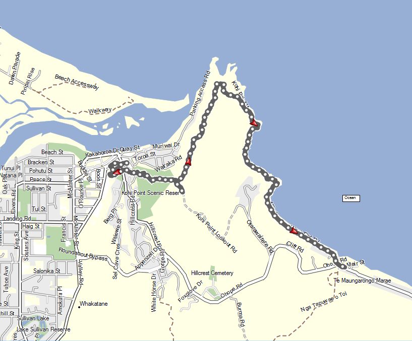 The Kohi Point Walkway connects Whakatane and Ohope, around the headland of Kohi Point, and Otarawairere Bay, passing several pa sites along the way. Total distance just over 7km, and a height difference from sea level to the Kohi Point lookout at 183m above sea level.