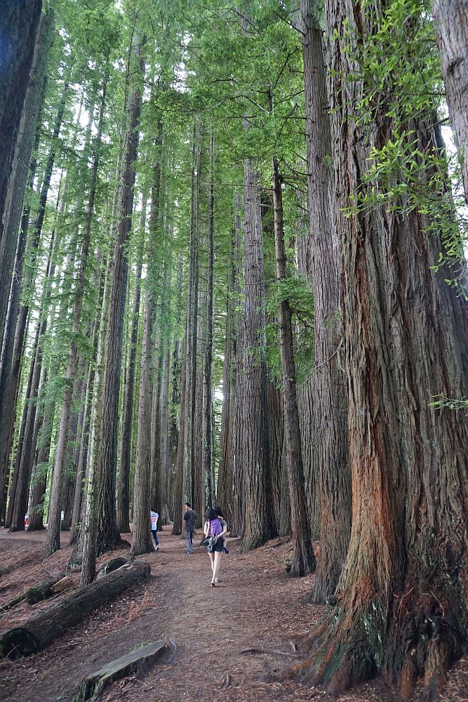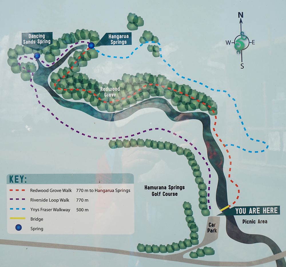 There is a track along either side of the Hamurana Stream, leading to the main spring. Each of them is about 770m long, making a total loop of about 1.5km. The track on the western side, the Riverside Loop Walk, runs alongside the stream and the golf course. The track on the eastern side, the Redwood Grove Walk, runs through a grove of redwood trees planted in 1919. A third track, the Ynys Fraser Walkway, runs close to the Redwood Grove track on the eastern side of the stream. The two main tracks are well formed, with no steps and only gentle slopes, so would be suitable for wheelchairs. The Ynys Fraser walkway is not formed as a track, but passes between bushes and other plantings over a grass area, marked only with occasional posts.