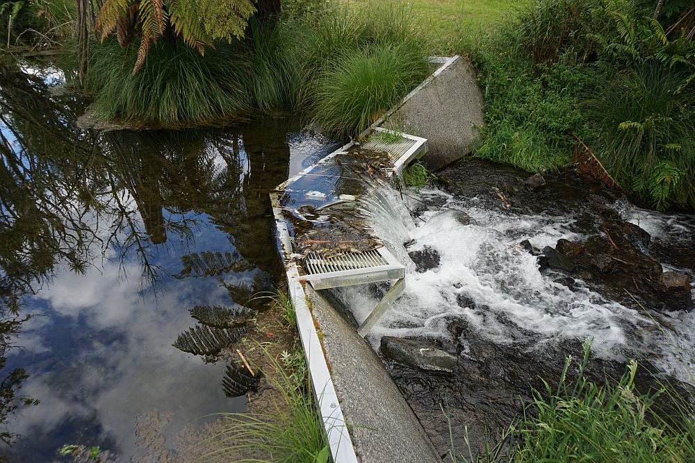 The upper part of a smaller stream alongside the southern end of the Ynys Fraser Walkway is protected by a weir from invasion by trout, to protect the native fish called koaro. The koaro can scale the concrete weir, whereas trout are hindered from jumping by the metal grate and the shallow water below the weir.
