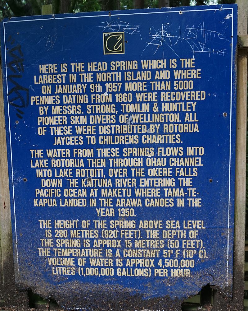 An older information panel with data on the head spring. The flow rate would be about 1250 litres/second, or 1.25 cubic metres per second. Almost twice the rate of the Blue Spring (see the Waihou Walkway post.)