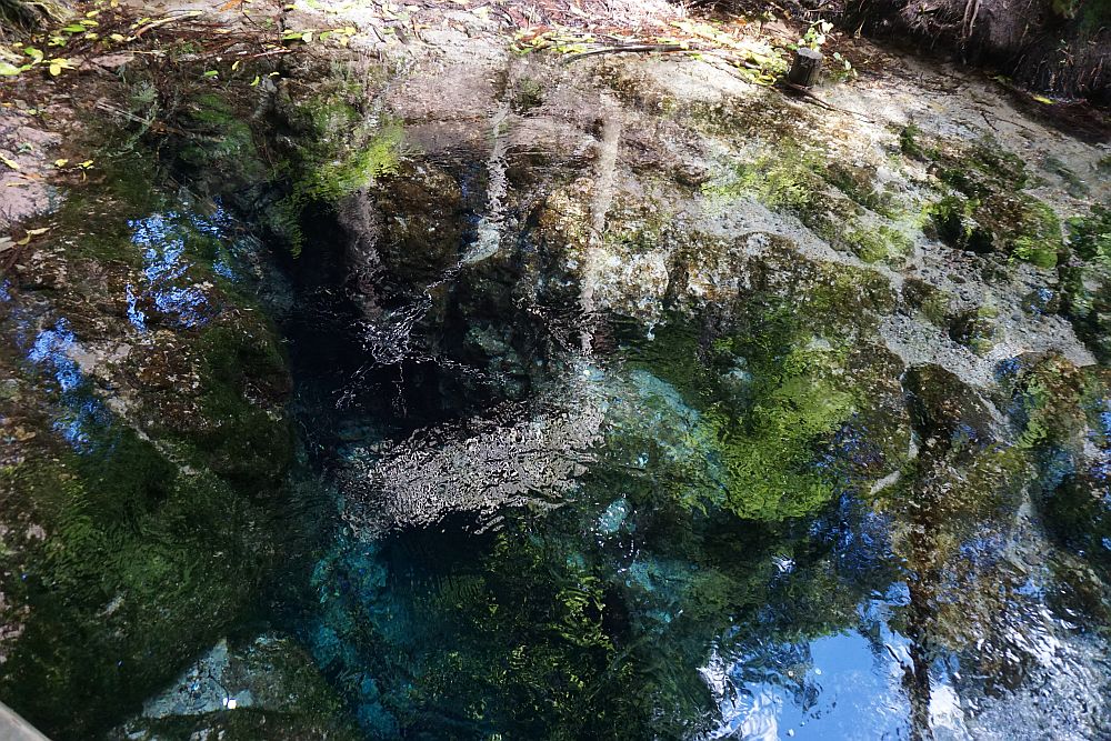 The head spring, seen from the lower lookout. A reflection of the upper lookout can be seen where the water rises from the spring.