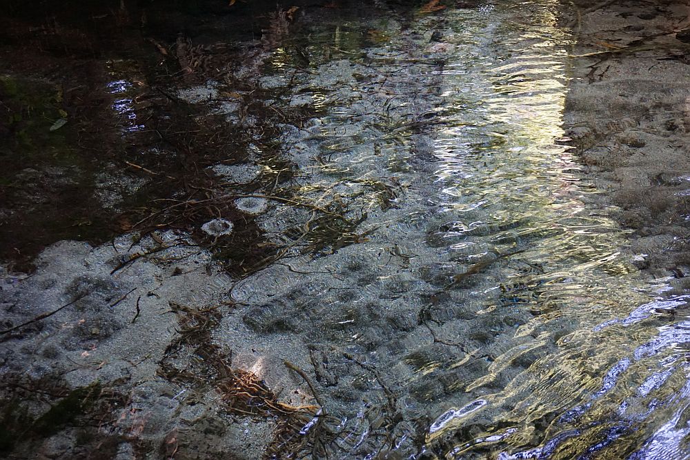 The Riverside Loop Walk passes by the Dancing Sands spring. The small darker clumps of sand that can be seen in the water are caused by water rising from the spring in numerous locations.