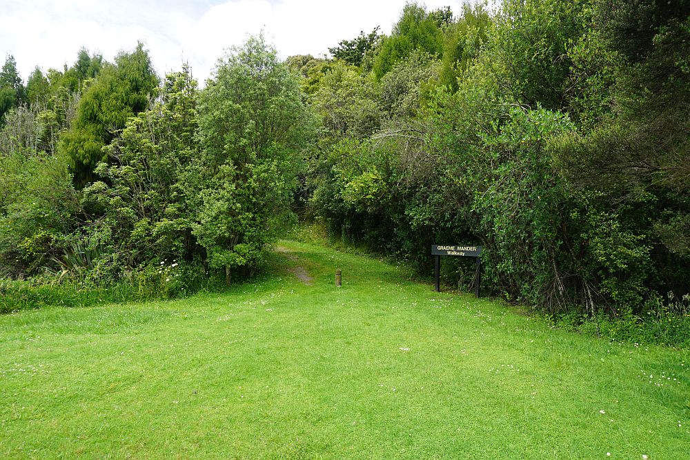 The start of Graeme Mander Walkway. The track continues as a wide, grassed walkway.