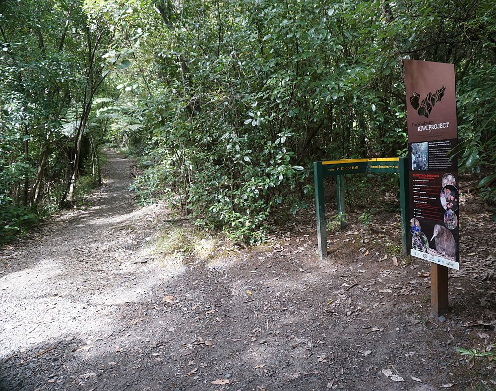 A short distance from the start of the track, it splits in two to form part of the Fairbrother Loop Walk. The two parts join again at the continuation of Nga Tapuwae o Toi. According to the pointers, the left (eastern) branch is a 20 minute walk and the right (western) branch is a 25 minute walk. So about 45 minutes in total for the Fairbrother loop. At the junction there is an information panel about the Kiwi Project.