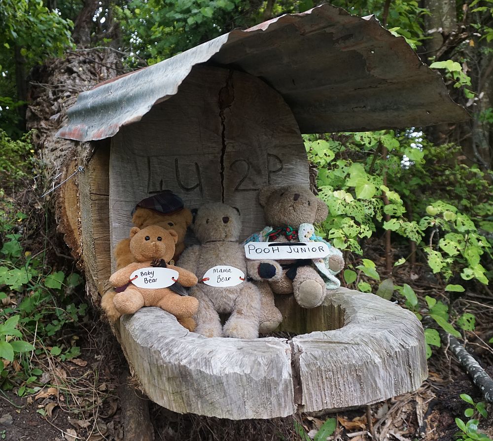 Someone has made use of a tree trunk which had fallen across the track. A ‘toilet seat’ has been carved in the log, and a selection of bears provided.