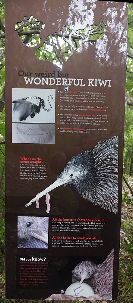 The information panels along the tracks have cutouts at the top, representing branches of Pohutukawa trees. This one also has information about Pohutukawa, or Christmas trees.