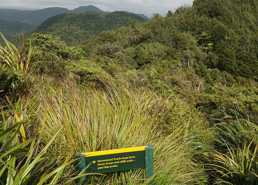 The sign at the upper end of the kauri loop track. The Tuahu Track continues to the right, to the top of the Kaimai Range.