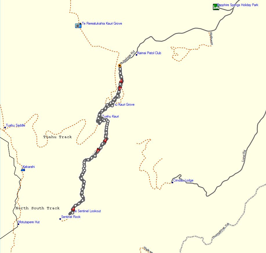 The Tuahu Kauri trees are about 1.5 km from the start of Tuahu Track, at the end of Hot Springs Rd, and the walk each way takes about 25 to 30 minutes. The total distance from Hot Springs Rd to the end of the Sentinel Rock Track is about 4 km, or 8 km for the total walk. Total time was about 3 hours 30 minutes, including time for taking photos and for a quick lunch. The GPS log shows the route taken and the location of the Tuahu Kauri, Sentinel Rock, and Little Sentinel Lookout.
