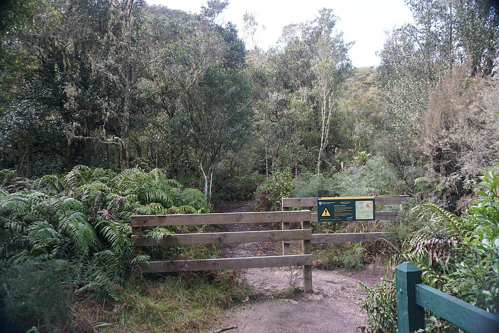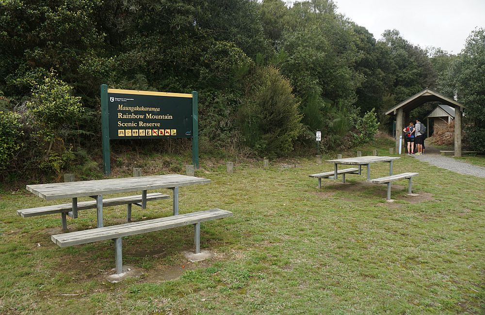 Picnic tables, signs, and information panels inside the archway at the entrance to the walking and mountain biking track to the crater lakes and the summit.