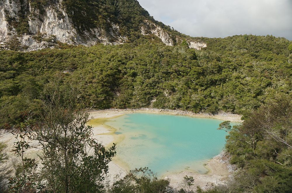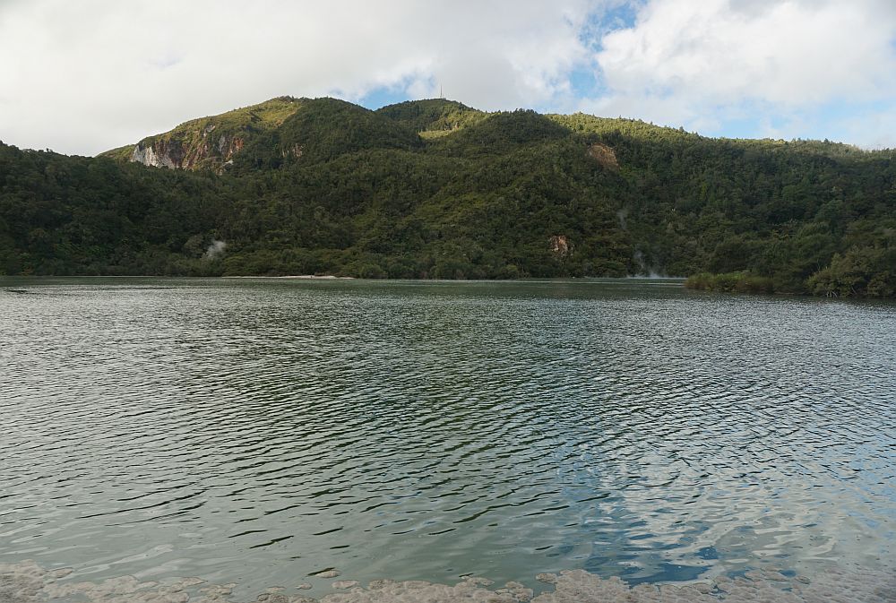 Green Lake seen from near Old Waiotapu Rd. Rainbow Mountain summit with the mast can be seen at the top centre of the photo.