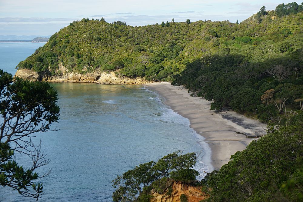 The track between Orokawa Bay and Homunga Bay is narrow and steep in places, with steep dropoffs of 80m or more to the ocean below. Shortly after leaving Orokawa Bay there is a good view back to the beach.