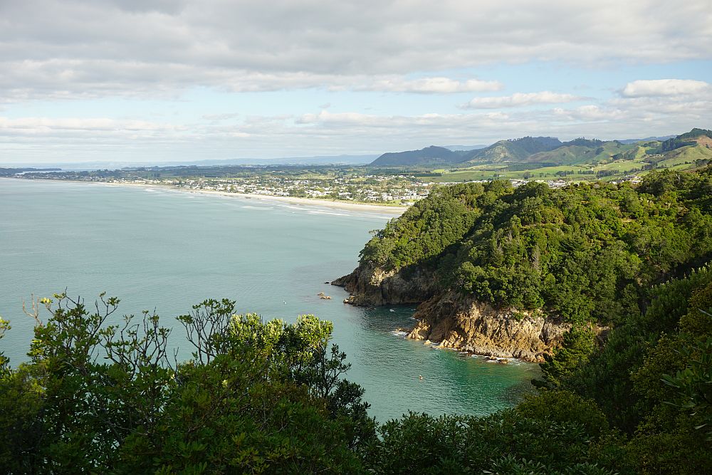 Two benches and lookout points are located on a headland not far from Orokawa Bay. The first looks back southwards to Waihi Beach.