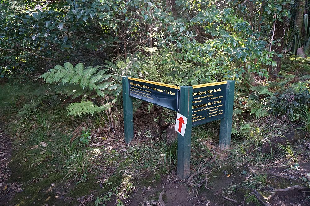 The William Wright Falls track joins up with the Orokawa Bay to Homunga Bay track at the northern end of Orokawa Bay. The sign indicates a time of 40 minutes each way.