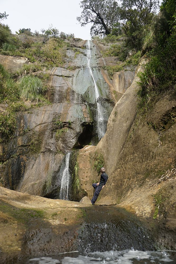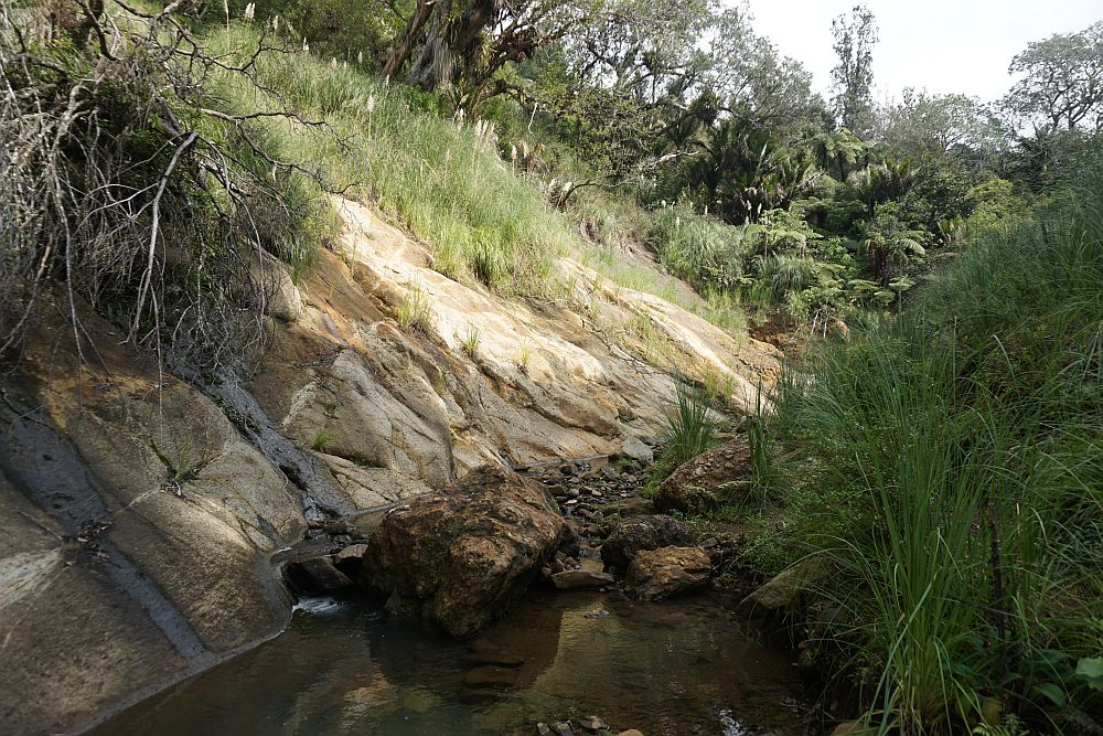 The track now follows and uses the dry part of the stream bed for most of the way to the falls. Only short parts of the original track are still used. The track is uneven, and can at times be difficult to locate. There are about 21 stream crossings each way, but normally these can be done with dry feet by stepping across on rocks. This is the first crossing.