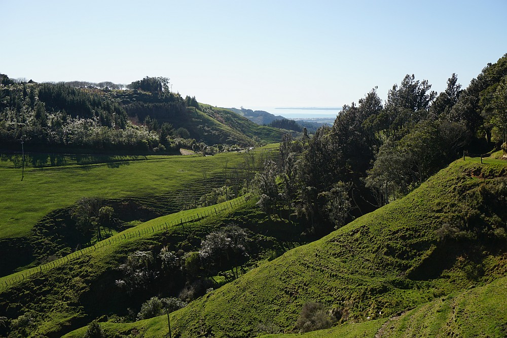 The view towards Tauranga. The track follows the fenceline down the hillside, joining up with the track just below the gorse bushes by the fence.