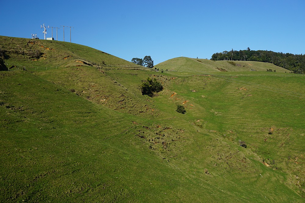 Various transmission towers are located on the farmland. The boundary of the reserve can be seen to the right. The track continues around the hillside below and to the right of the towers. The Whareotetarakeho trig can just be seen at the highest point to the left of the bush boundary. The track will pass this trig station on the return.