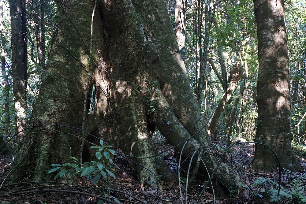 A large tawa tree has a platform growing on the trunk, about 6 m above the ground.