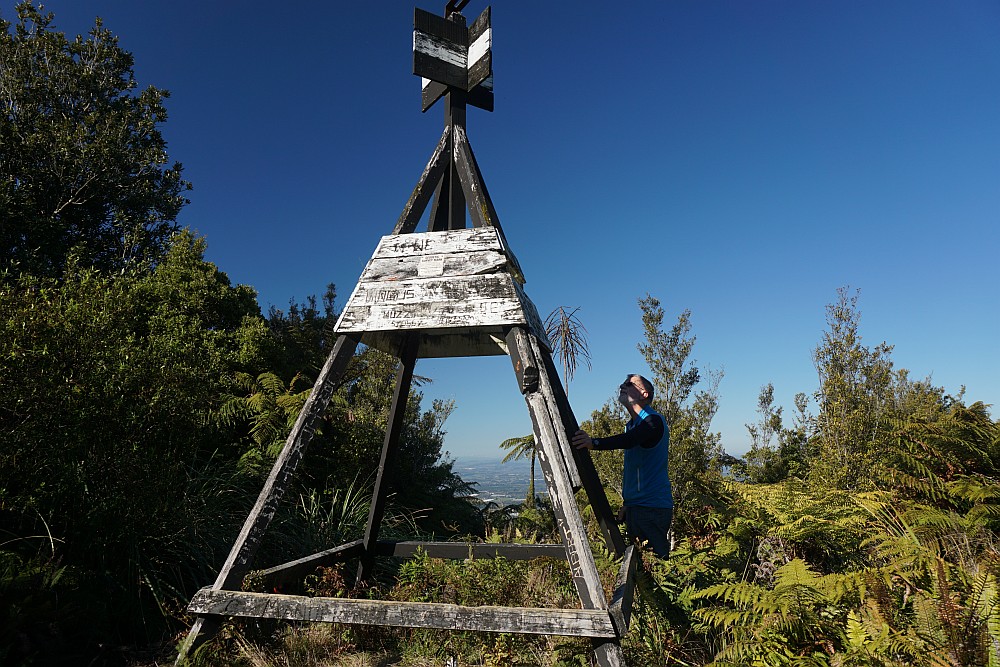 An old DoC sign by the trig showing distances and times. Upper Papamoa Rd is the old name for Te Puke Quarry Rd, occasionally still used and seen on maps that have not been updated. Official topographic maps show the trig as being 565 m asl.
