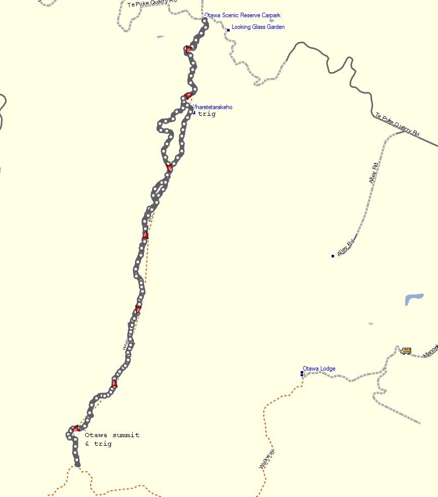 The GPS tracklog shows the route walked, and the locations along the way. The car park on Te Puke Quarry Rd is at the northernmost end of the log. Whareotetarakeho Trig is near the boundary of the reserve. The divergent tracks, the left one on the uphill walk, and the right branch on the return can be seen here. Otawa Trig is near the southern end of the log, about 400m north of the junction of the two tracks.