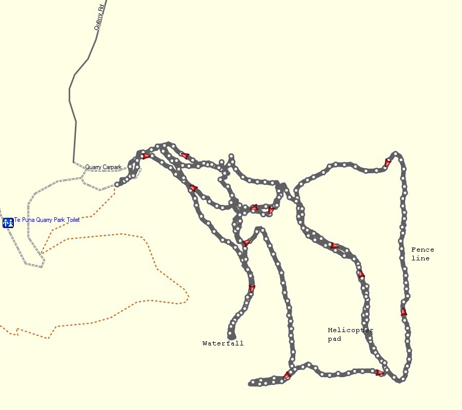 The GPS tracklog shows all the tracks walked. Several, such as the bulldozed track, were walked twice, but due to satellite reception they may appear as two distinct tracks.