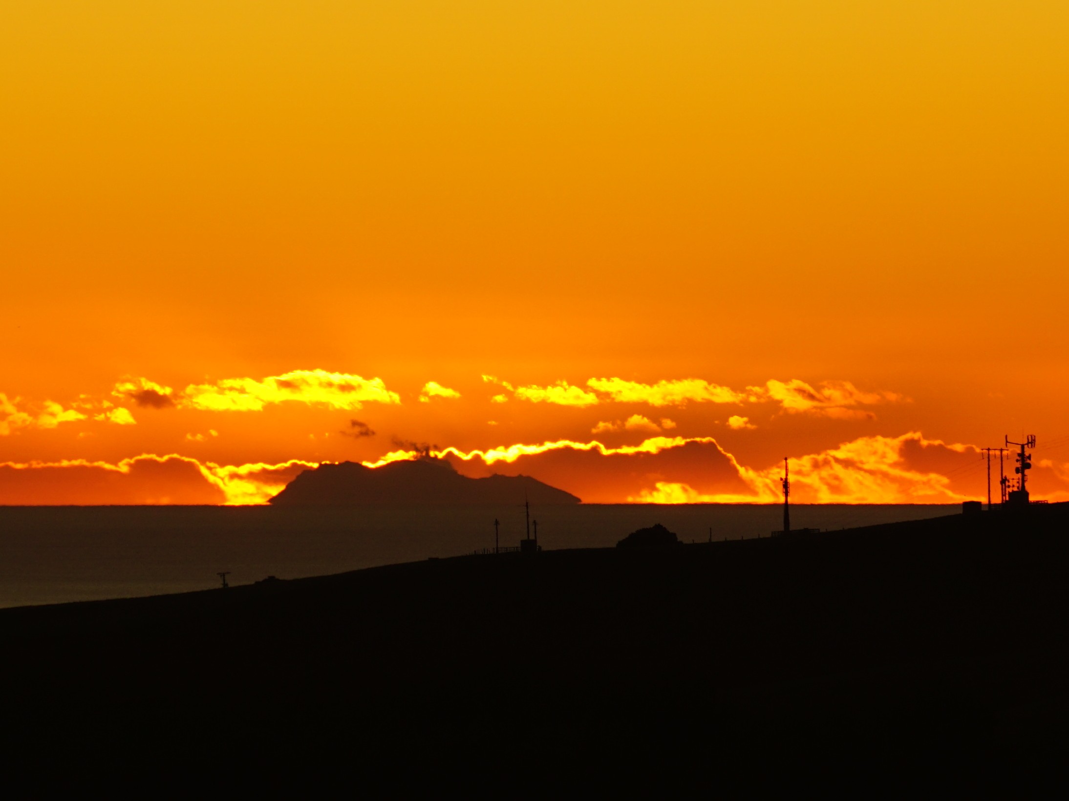 Sunrise over Whakaari / White Island, seen from the hills above Papamoa about 80 km from the island in August 2015.