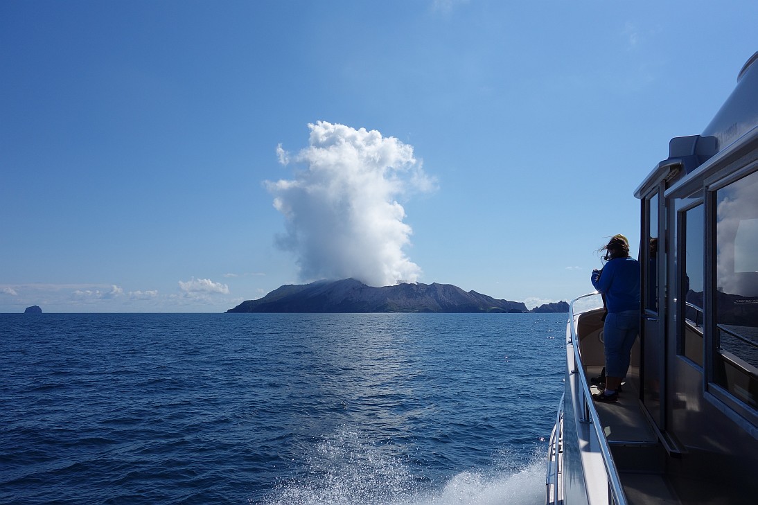 Looking back at Whakaari / White Island, now with a ‘mushroom’ cloud of steam above it.