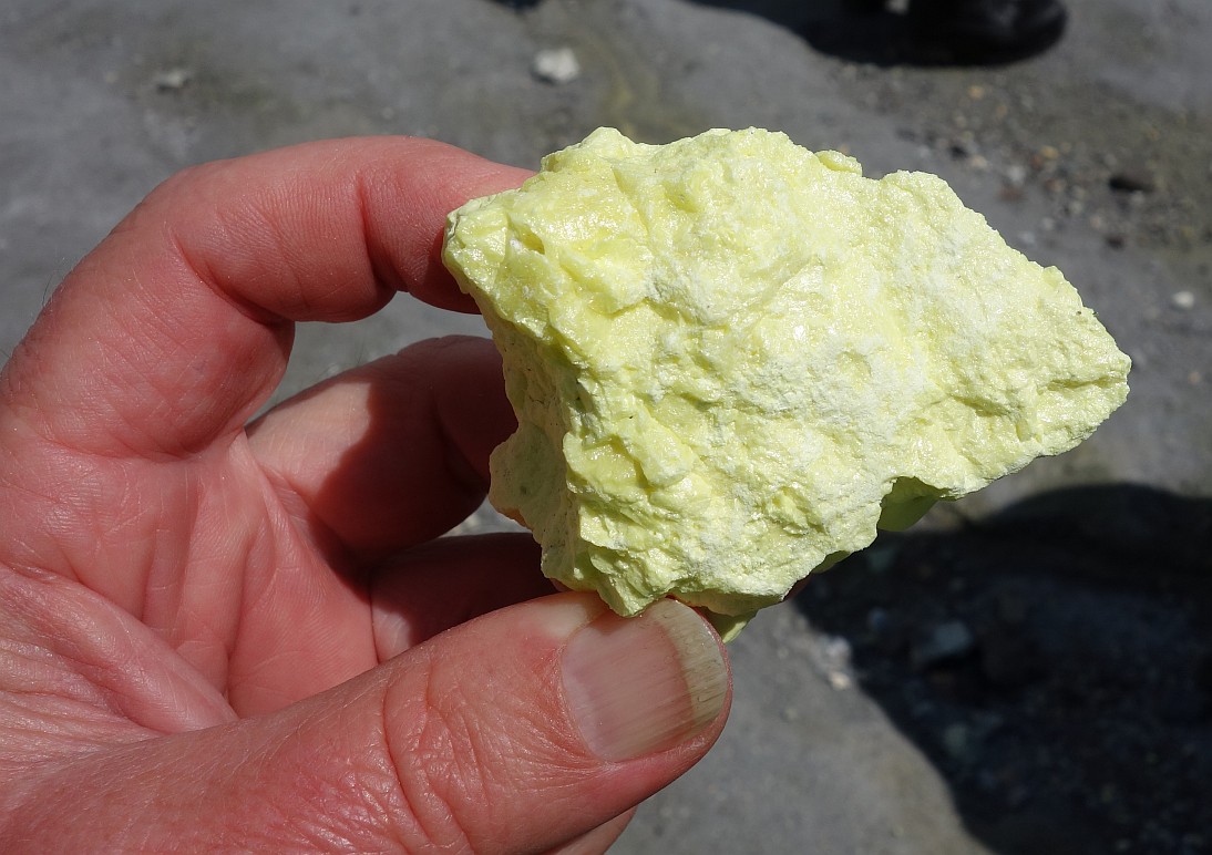 Sulphur is used in several industrial processes, and was previously used as an anti-bacterial agent. Here a lump of sulphur, which itself has no taste and no smell. Unlike hydrogen sulphide which has the smell of rotten eggs associated with many geothermal areas.
