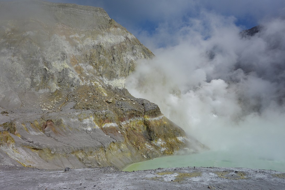 The edge of the crater, with the crater lake visible through the steam.
