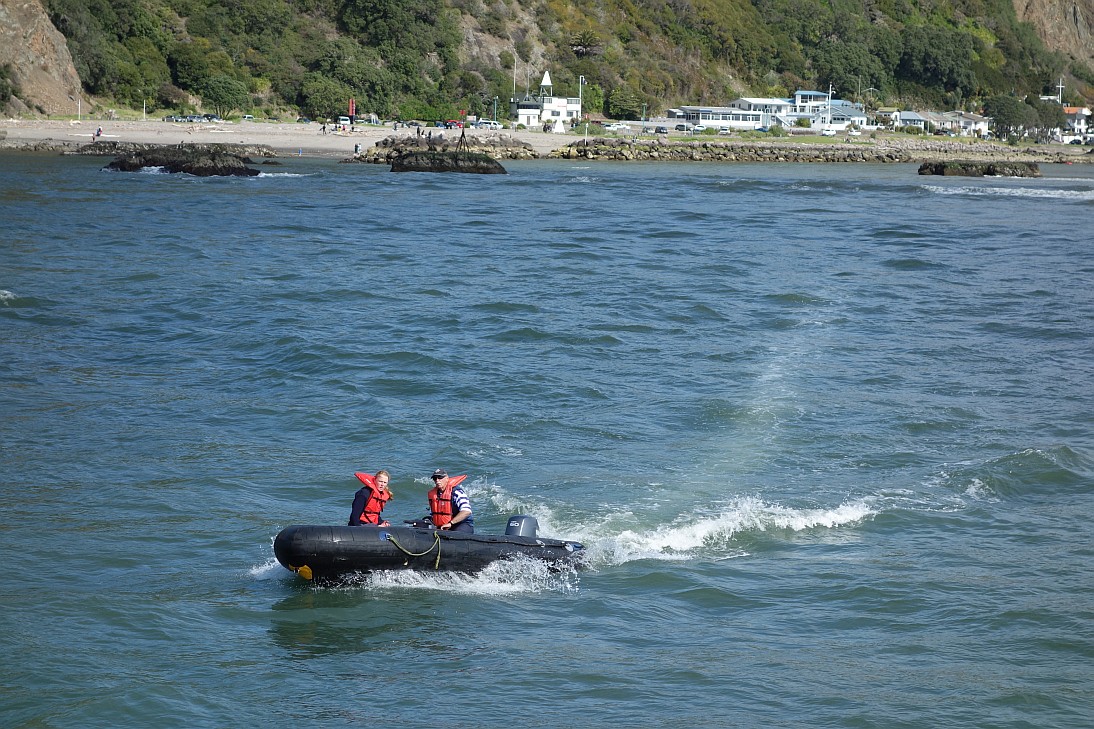 The return to the Whakatane River was at low tide, so the skipper and a tour representative were sent out in the dinghy to gauge the depth of the sand bar. It was touch and go.