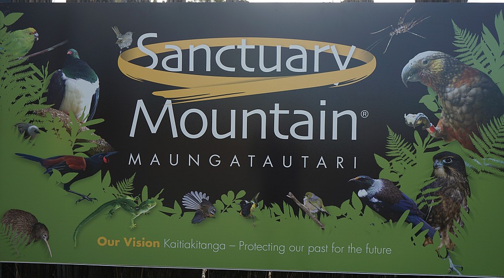 Sign at the entrance to Sanctuary Mountain, showing some of the native birds offered protection within the forest.