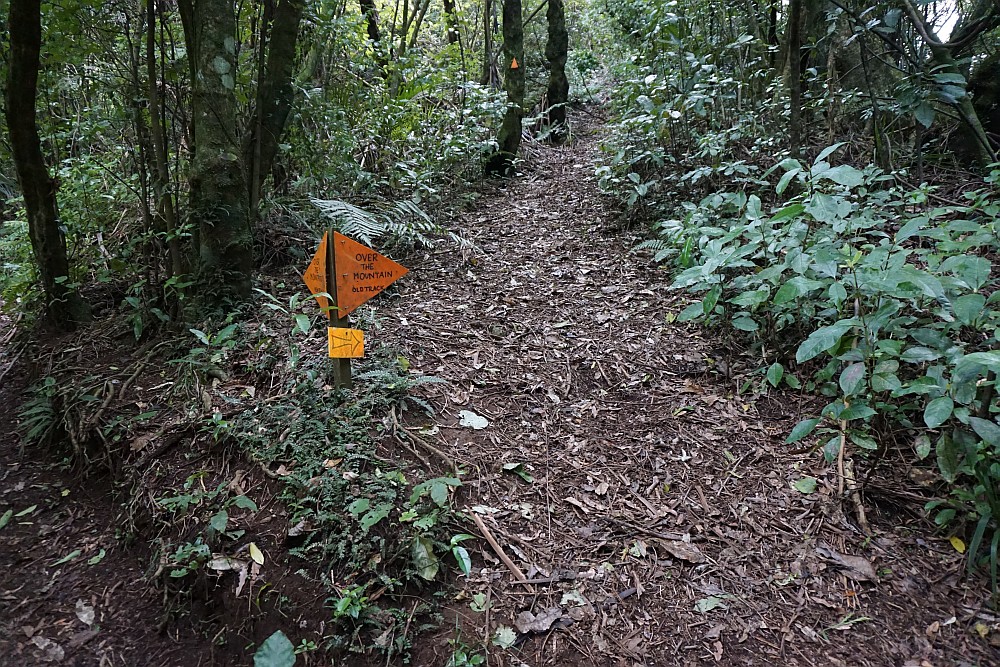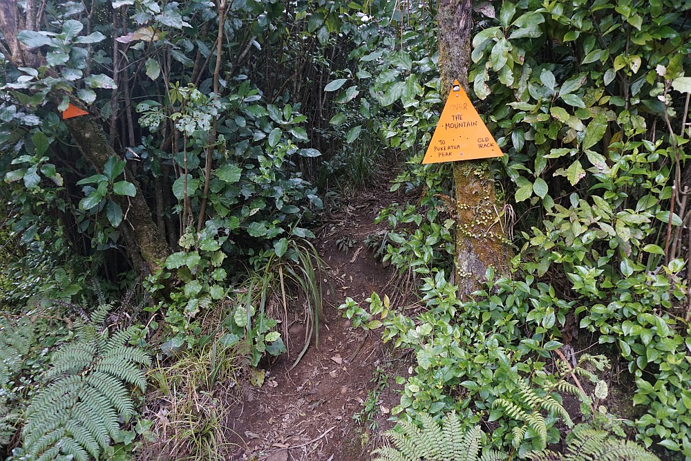 The remains of the original forest track between Tari Rd and Pukeatua peak consists of two sections. The lowest one is a short, easy section running quite close to the new track. The southern end of this part branches off here, with the new track on the left and the original track on the right.