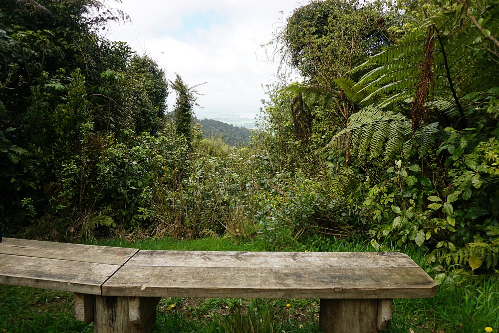 A short side track to the saddle branches off the main track which continues on to Maungatautari peak. The new track back to Tari Rd is on the right. The start of the track to Pukeatua peak, the rocky outcrop, and a bench and rest area, is on the left.