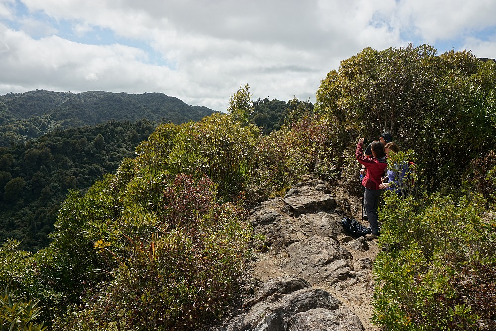 The track to the rocky outcrop is narrow and steep. Pukeatua peak can be seen at the upper right.
