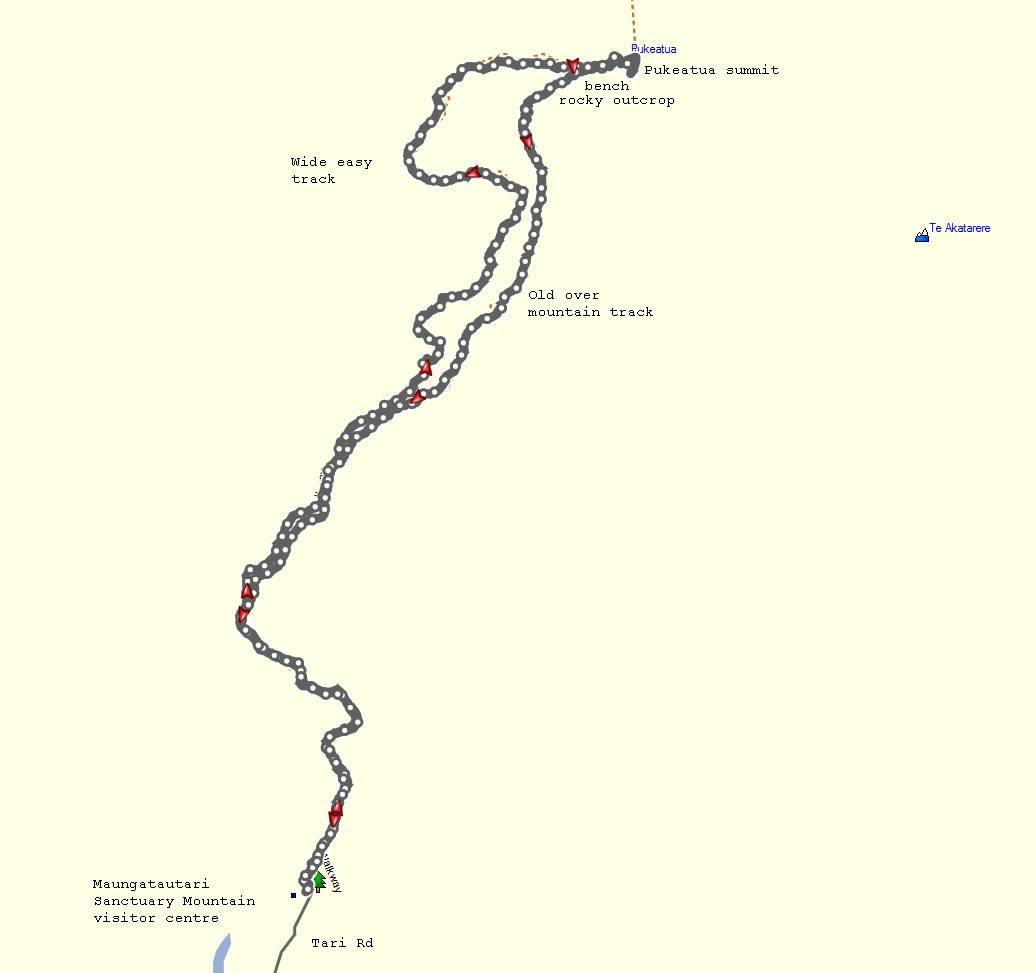 A wide gravelled track suitable for quad bikes has been constructed between Tari Rd and Maungatautari peak. The intention is to  continue this to the northern entrance to the sanctuary, providing an easier over-the-mountain route. Currently the original track can be followed from Pukeatua peak to Maungatautari peak and onward to the northern enclosure, and for part of the way between Tari Rd and Pukeatua peak.
