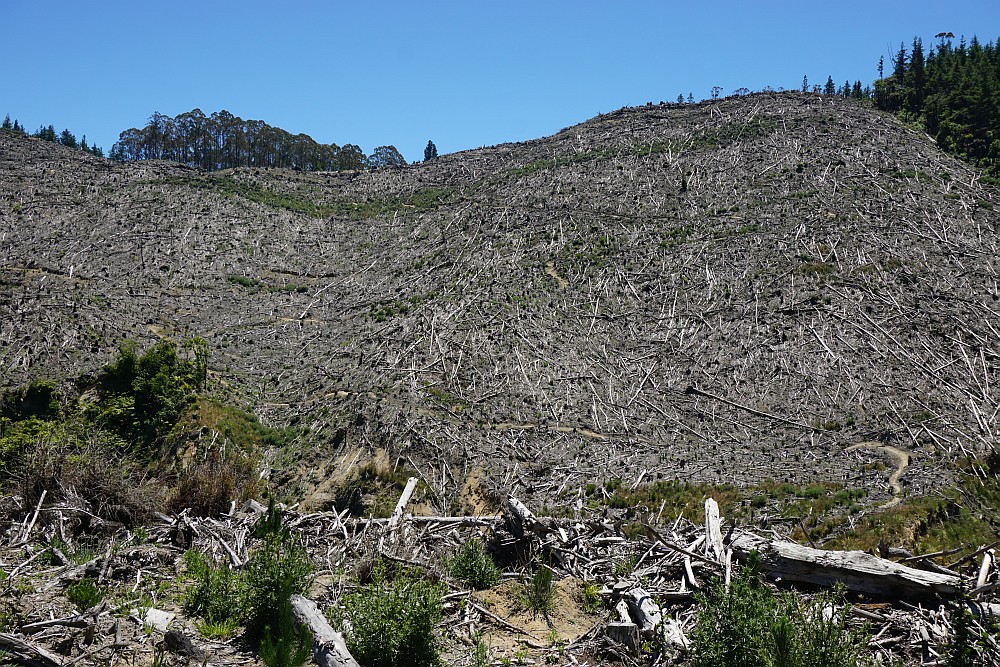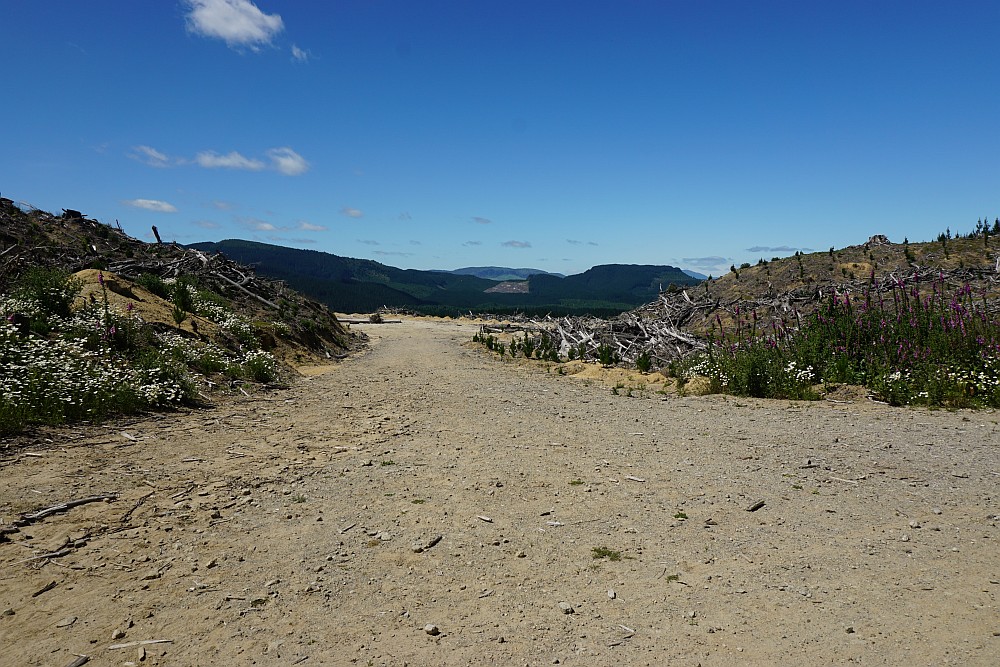 The walking track emerges onto Tokorangi Pa Rd again, just across from a skid site down a short road, used during recent forest operations.