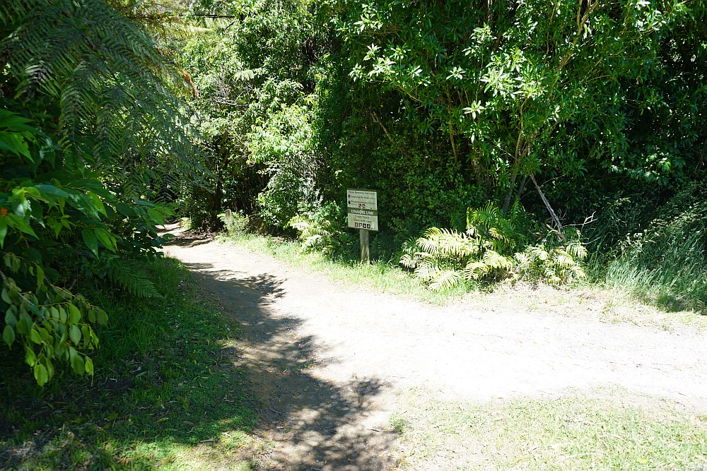 The walking track meets up again with the horse track (Tokorangi Pa Rd). The sign pointing up the horse track says it leads to Tokorangi Pa Lookout. However, following the horse track back to the skid site provided no better lookout than the one at the skid site. The walking track (on Tokorangi Pa Rd) continues downhill to the left.