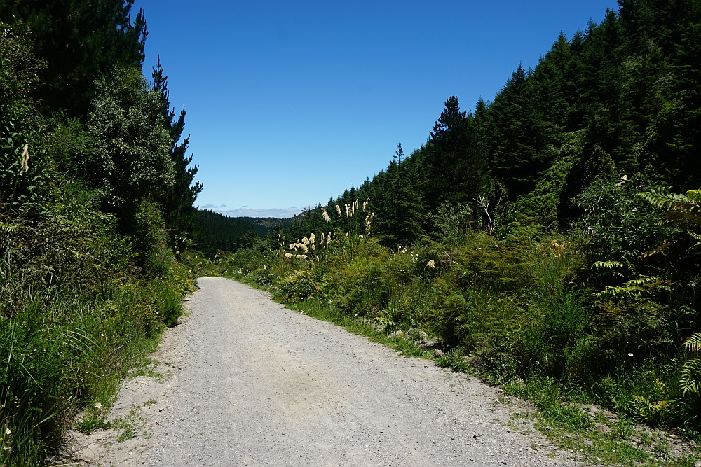 Tokorangi Pa Rd is a forestry road, wide enough for a vehicle. It is shared, with walkers, horse riders, and mountain bikers all using it. The walk continues along the road to the left.