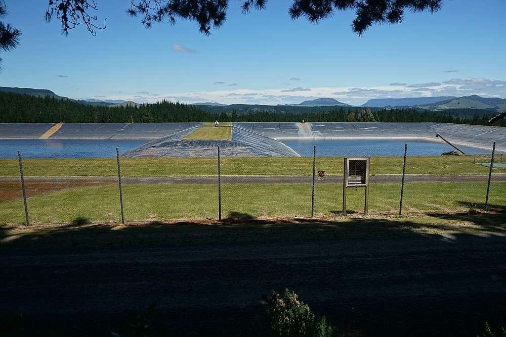 The track emerges from the forest at the effluent treatment plant within the Whakarewarewa Forest. The water with nutrients is used within the forest area to reduce the pollutants in Lake Rotorua.