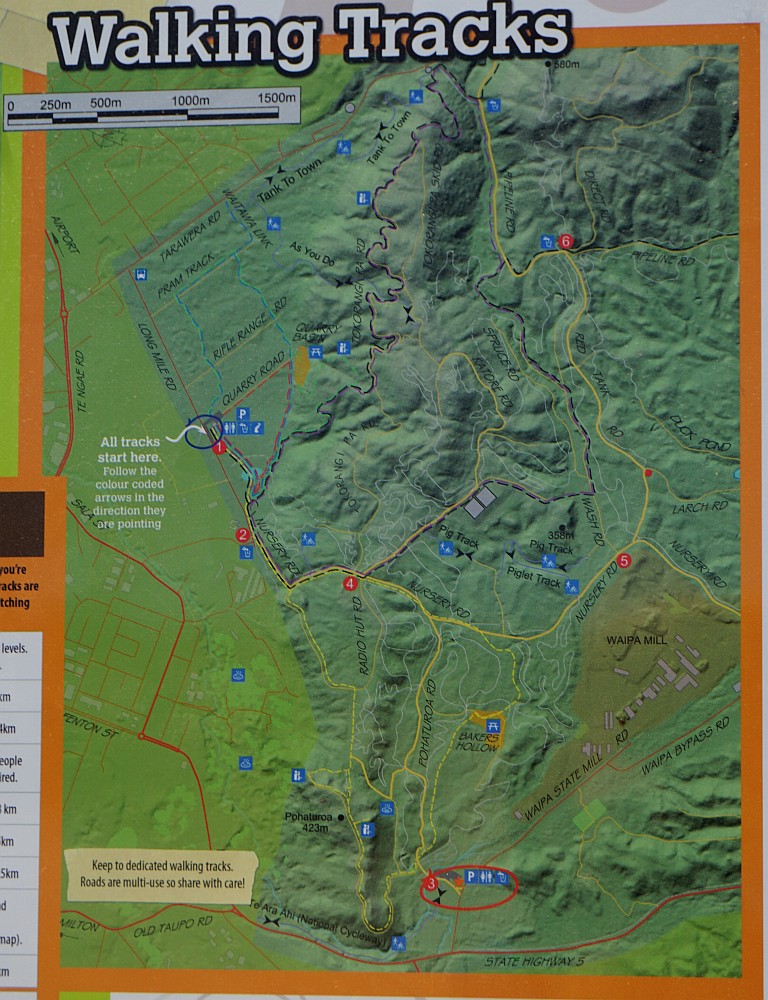 The map of walking tracks found at various locations, both at the start of the walk, and a couple of places alongside the track.