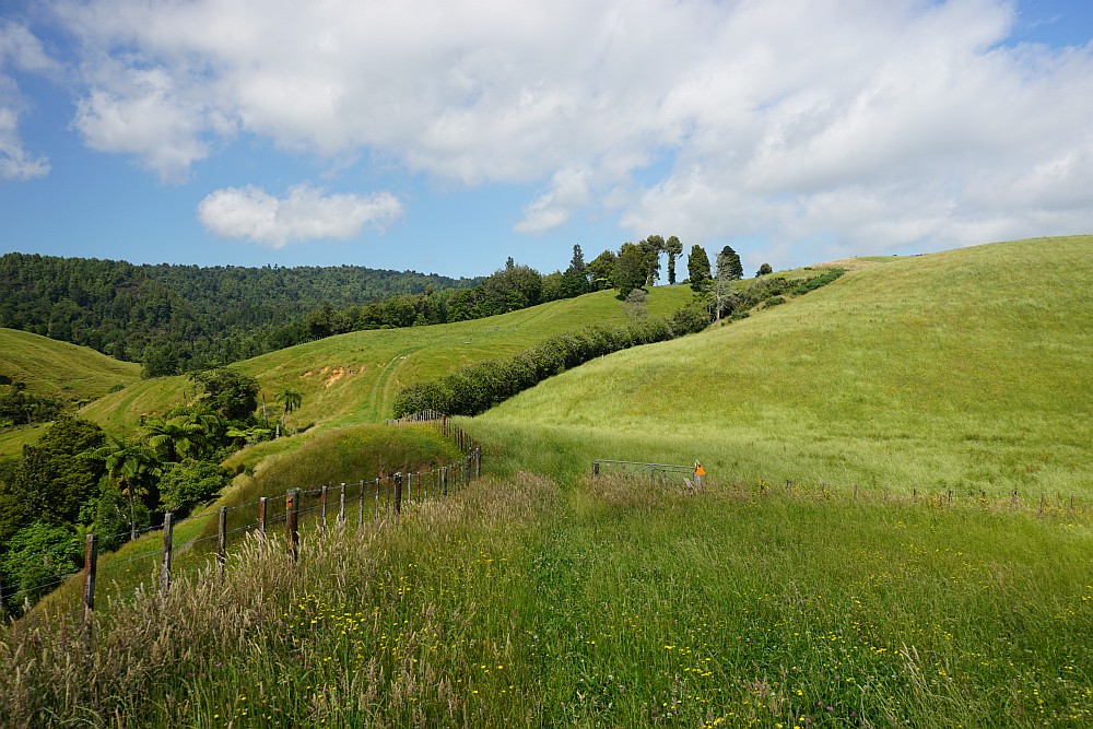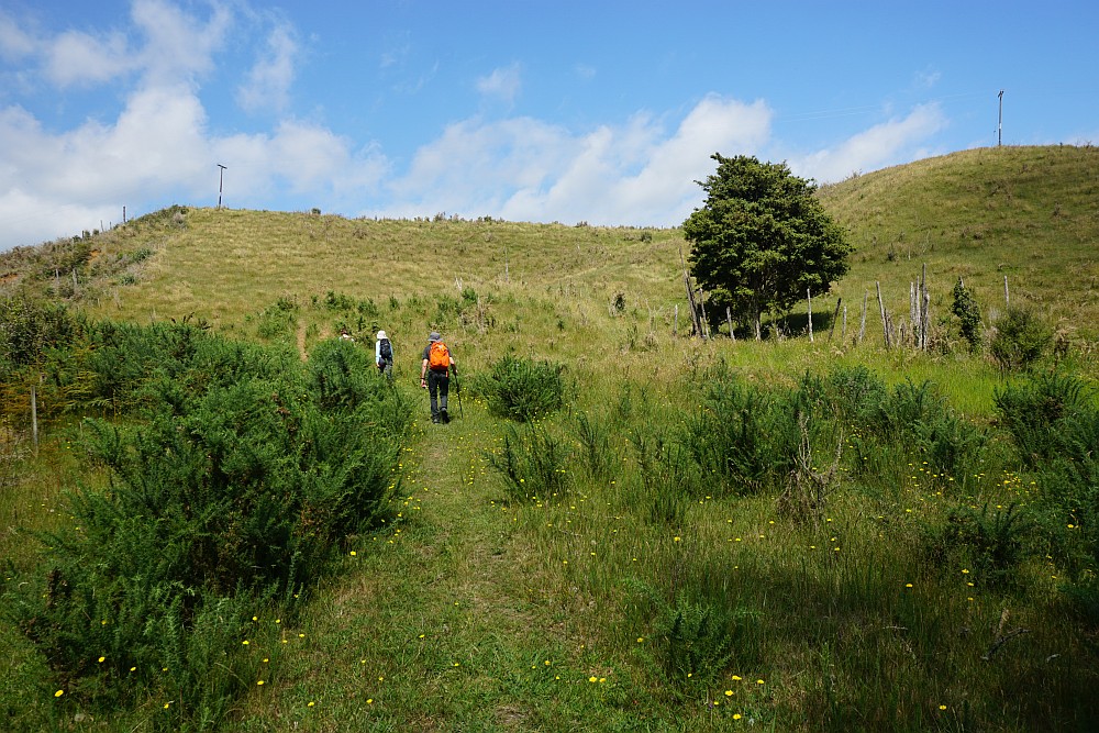 The track markers are not always easily visible, especially in the long grass. The track continues climbing through farmland for about 850m before entering the forest park. This is near the start of the climb.